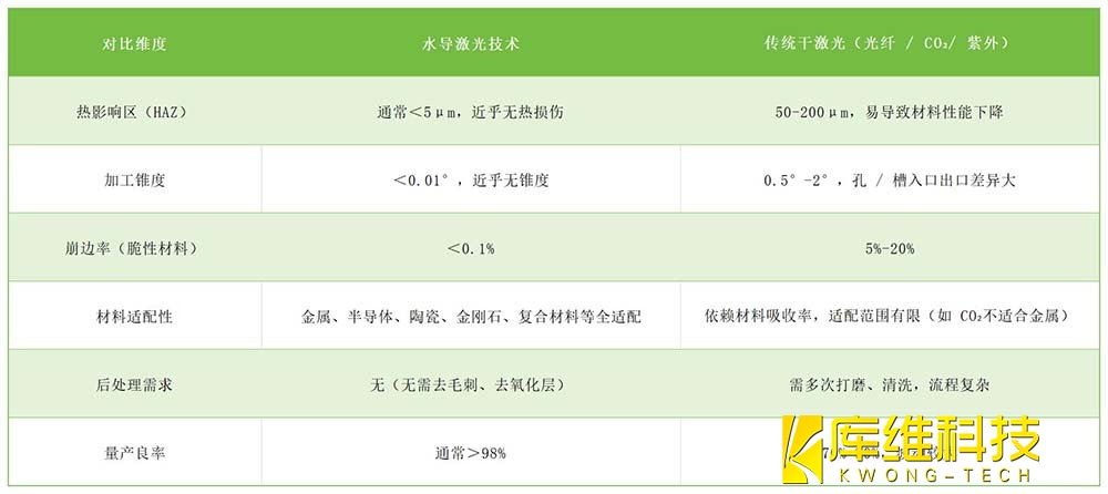 为更直观体现优势,以下是水导激光与主流传统激光技术的关键指标对比: