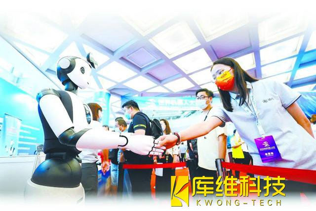 2022世界机器人大会上,一位参观者与一款人型机器人握手互动。(图片来源:视觉中国)