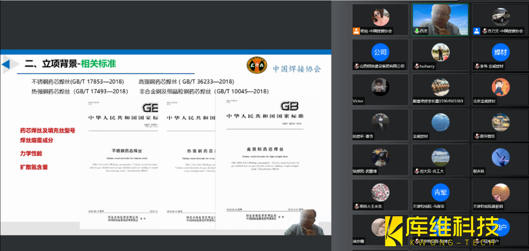 焊接协会召开了线上团体标准宣贯会,会议由中国/business/content1.html协会副秘书长方乃文主持。会议邀请了上海电机学院材料连接与界面工程研究所副所长刘西洋副教授就T/CWAN 0042—2020 《药芯焊丝制备工艺及质量评价规范》团体标准进行了宣贯解读。线上共有30多家单位40余位代表参加了宣贯会。