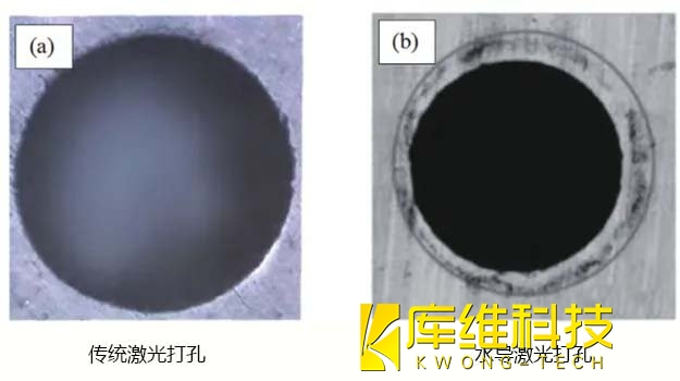 对比传统激光打孔与水导激光打孔技术,差异一目了然。传统激光打孔技术获得的孔,边缘比通过水导激光获得的孔的边缘更加粗糙,若要获得更精细的孔,还需进一步的加工处理。而水导激光加工得到的孔,边缘圆滑,没有毛刺,获得了更好的加工质量,具有明显的技术优势。