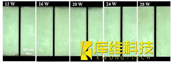 针对LTCC基板,采用波长532 nm的纳秒激光,功率12-28 W,水射流速度180 m/s。加工结果显示: