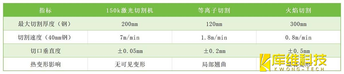 传统等离子切割或水刀工艺在超厚板(≥40mm)加工中普遍面临效率低、热影响区大、切口粗糙等问题。而150k激光切割机通过以下技术参数实现跨越式升级: