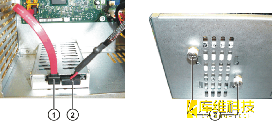 存储盘划分为三个分区,其中第三个分区属于隐藏的恢复分区。该分区可通过库卡恢复工具来读写。第一 分区与 C 盘对应,而第二分区则与 D 盘对应。数据线通过 SATA 插头与主板连接。