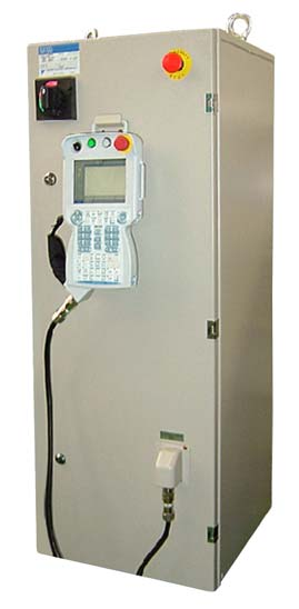 工业机器人控制柜 DX100(如图所示),主要由主控、伺服驱动、内置 PLC 等部分组成。除了控制机器人动作外,还可以实现输入输出控制等。主控部分按照示教编程器提供的信息,生成工作程序,并对程序进行运算,算出各轴的运动指令,交给伺服驱动;伺服驱动部分将从主控来的指令进行处理,产生伺服驱动电流,驱动伺服电机;内置 PLC 则主要进行输入输出控制。控制柜在机器人进行作业的时候,通过输入输出接口,给焊机发出焊接指令,并监控焊机的工作情况。同时还对周边装置进行控制。其主要功能如下: