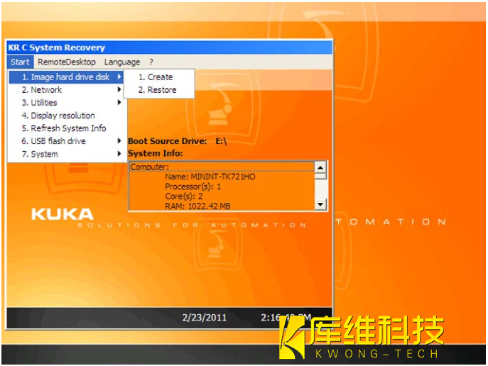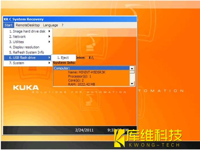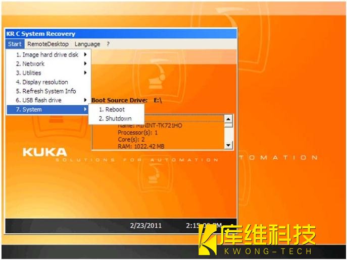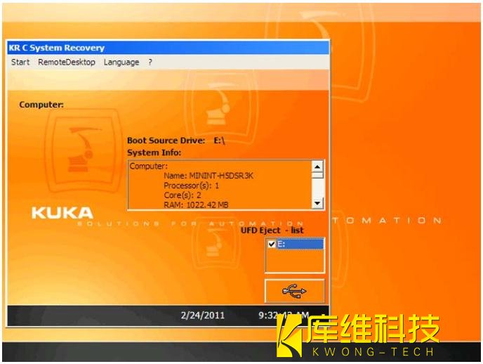 2. 插上具有起动功能的库卡 U 盘,然后重启控制系统。